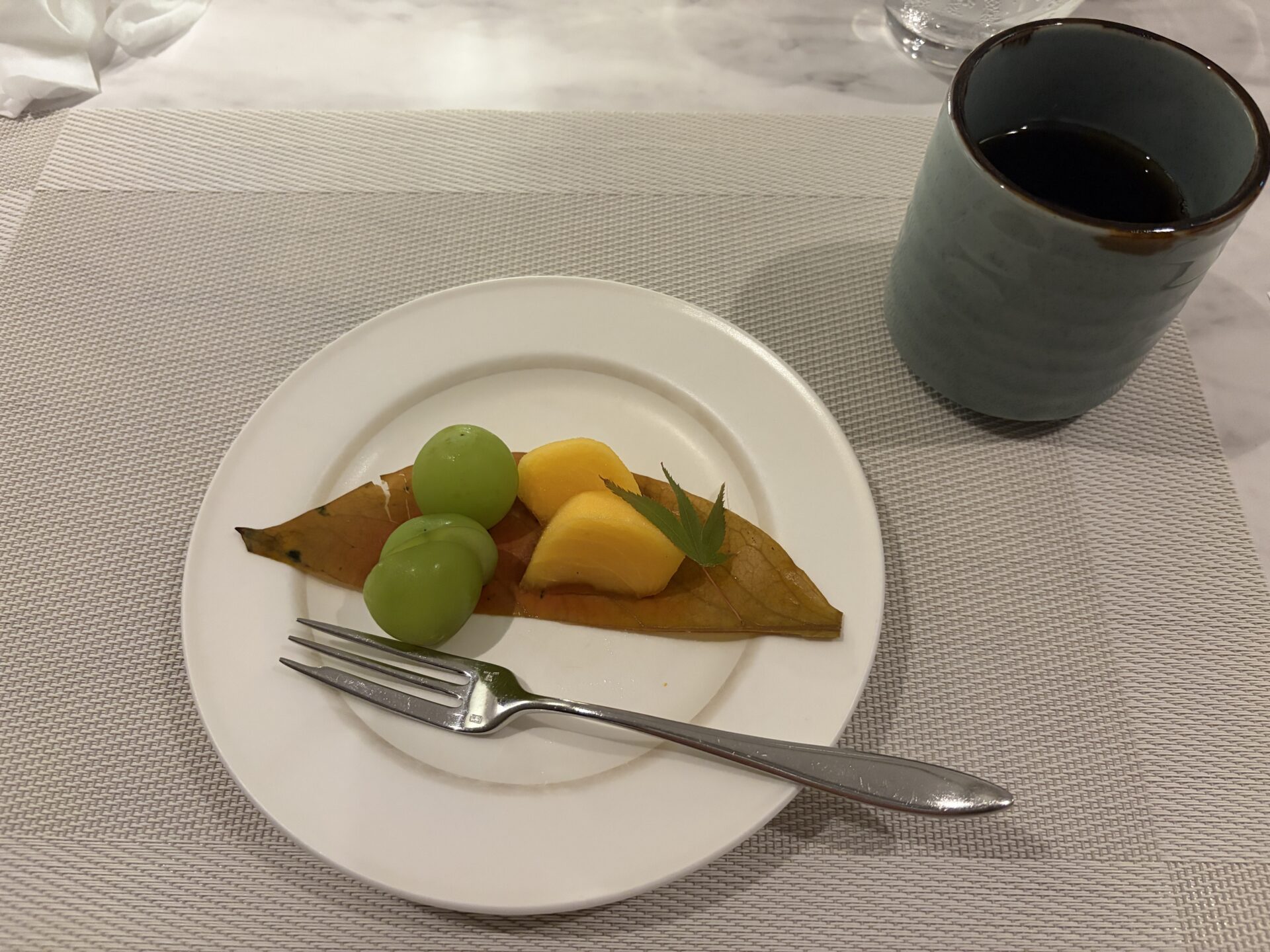 ご飯も赤だしもペロリと平らげて、食事の最後にはシャインマスカットとカキがデザートで出てきました↓