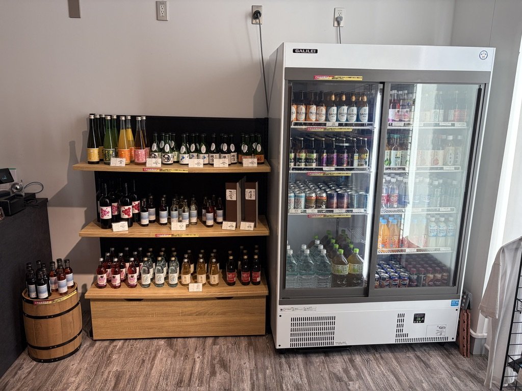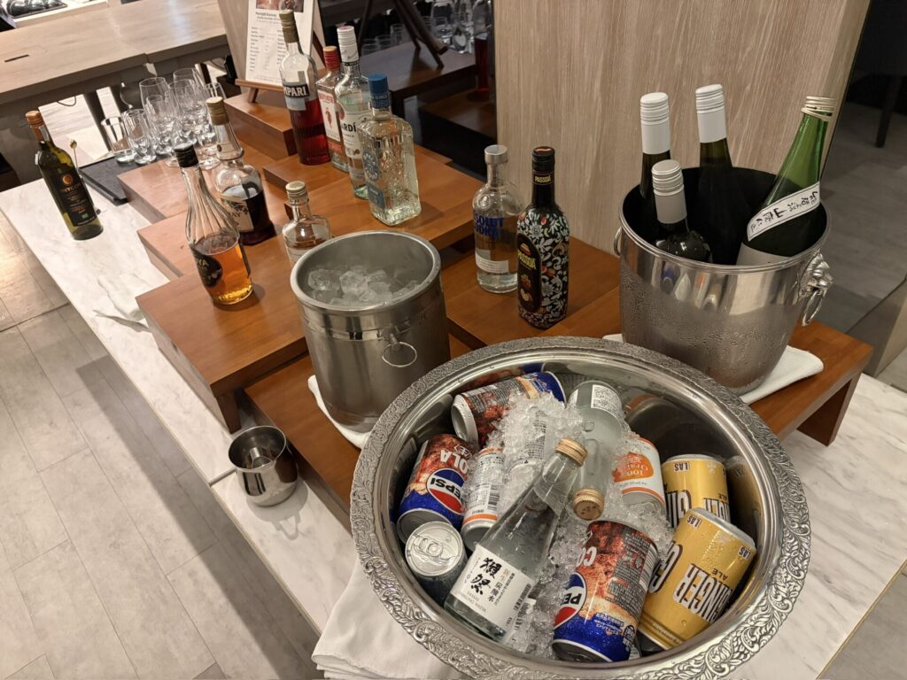 フリーフローコーナーにはワインや日本酒、ソフトドリンクがずらりとラインナップ↓