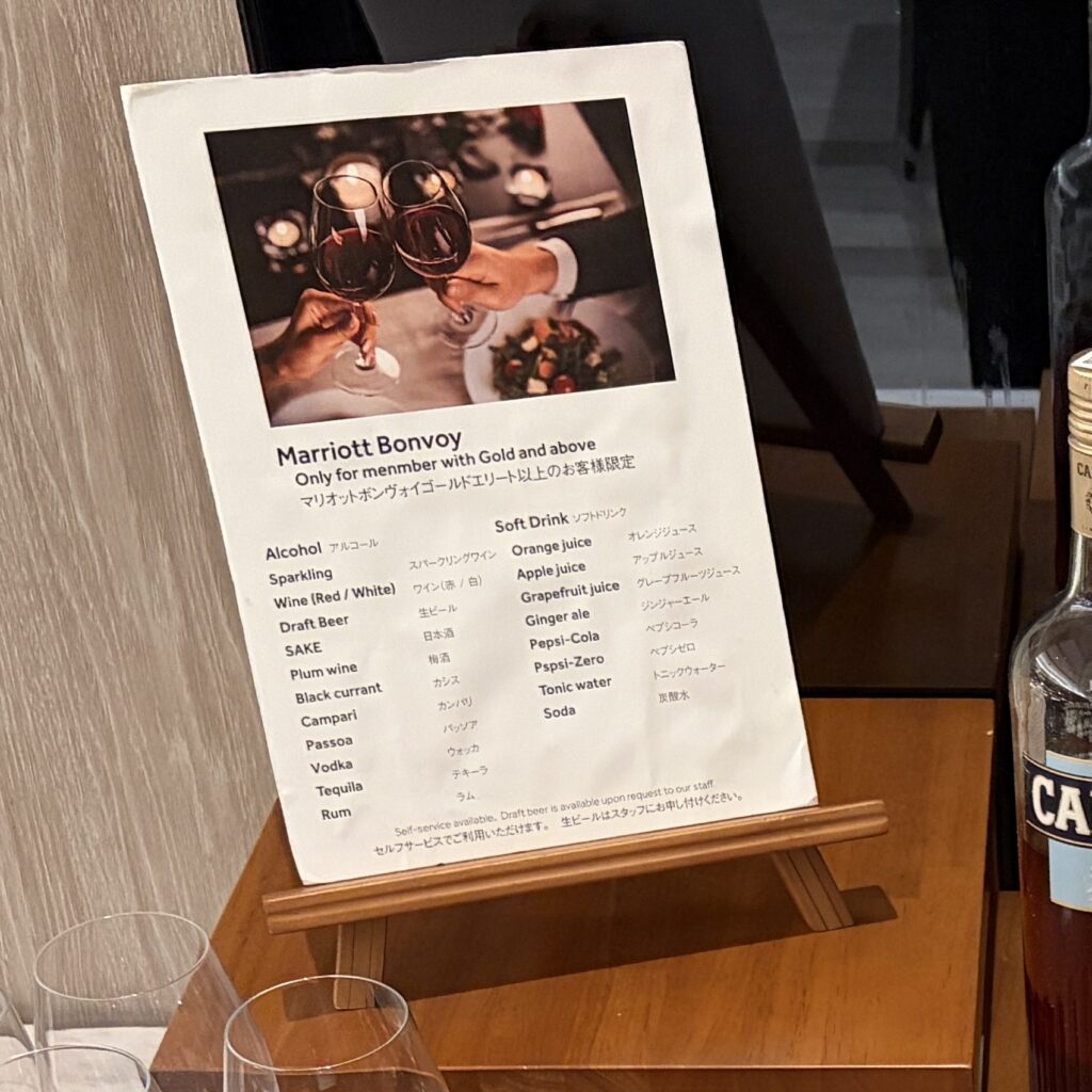 ちなみに、マリオットボンヴォイゴールドエリート会員以上なら、アルコールを含むドリンクが飲み放題!