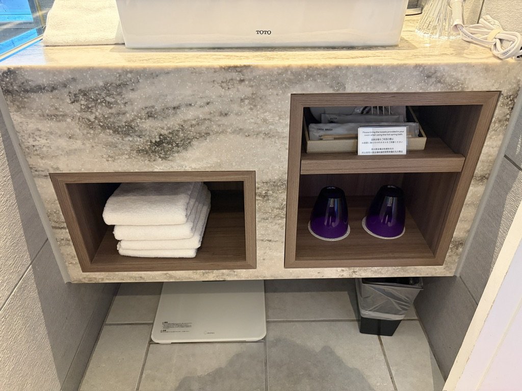 カウンター下には、タオルやアメニティ類が収納されています↓