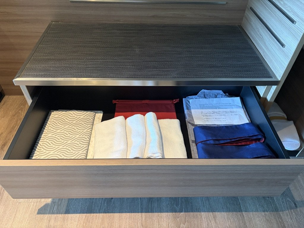 下の引き出しを開けると、タオルや浴衣が収納されていました↓