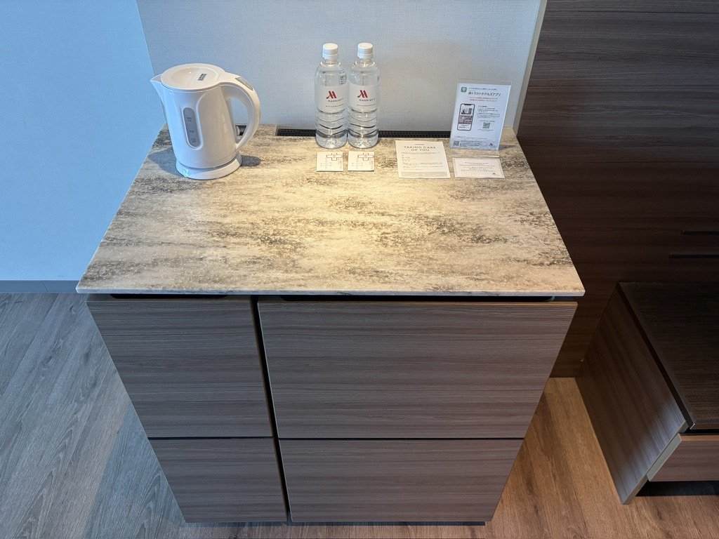 棚の上には、ミネラルウォーターと電気ケトルが置かれています。