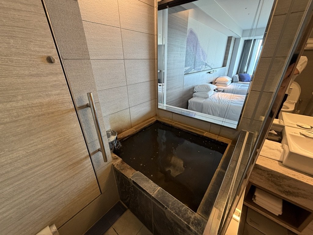 続いて、このお部屋の最大の魅力である、自家源泉を引く温泉バスルームをご紹介します!